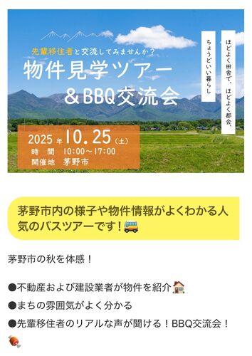 10/25に 茅野市へ行ってきました! 事前に、当日の詳細の案内メールをいただきました 来週末10/25(土)物件見学ツアーの詳細を別添ファイルの通りお送りいたします。 ◎当日のツアーについて当日は9時30分より茅野市役所議会棟にて受付開始となります。お車…